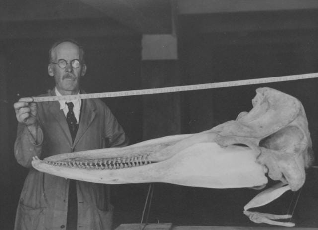In November of 1933 a whale beached up the coast at Hāwera. The director of the Whanganui Museum, a man named George Shepherd, wanted the specimen for his collection. He traveled up the coast, dismembered the carcass, and shipped it home on the train. Back in Whanganui, he secretly laid the whale parts out on the museum’s roof to finish decomposing. Neighbors complained, but no one could place the smell. Once clean and dry, the skeleton was his museum’s centerpiece for years.