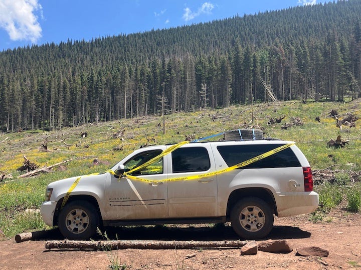 This abandoned Chevy Suburban at a beloved Colorado trailhead. That’s police tape. I don’t know what’s going on here. The driver’s window was smashed out from the inside. The passenger seat was full of dusty power tools. In the hutch between the seats was a notepad with the name and phone number of a Colorado Springs realtor written in fat black marker.