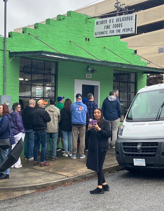 I though we were just going to see some shows. Turns out we’re attending a full-on R.E.M. convention, and all us convention-goers are trying to score lunch at Weaver D’s, the legendary soul food joint whose slogan R.E.M. borrowed to name 1992’s Automatic for the People. Weaver D’s has been sold and is maybe closing that very weekend? Nobody knows for sure. A long line of old male record dorks take selfies as we wait.6 One of the owners—perhaps the daughter of owner Dexter Weaver?—comes out to shoot her own video and we all cheer on cue.