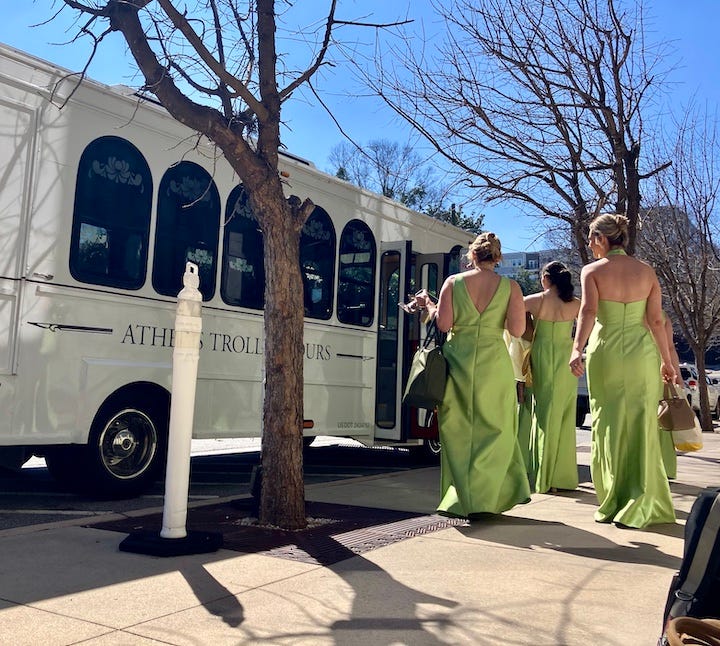 We wake up Saturday and Trump has bombed Iran. Nobody cares. That’s my hangover talking, but also the Great American Hangover: we’ve been bombing the Middle East my entire life. I am out of words, out of gas, out of futures. Doug drives the band north while Andrew and I hunt down a Bloody Mary and another fried chicken sandwich. The pale sun shines bright as it can on a Great American College Town. It’s game day. The bars are filling up, and the frontyards of frat houses. Shirtless boys circle the beer-pong tables. A cloud of chartreuse bridesmaids float out of their hotel and into a waiting trolley. They look amazing. The trolley is actually a bus. The bridesmaids will never wear those dresses again. It’s the end of the world as we know it. I’ll be back in Athens next year. //
