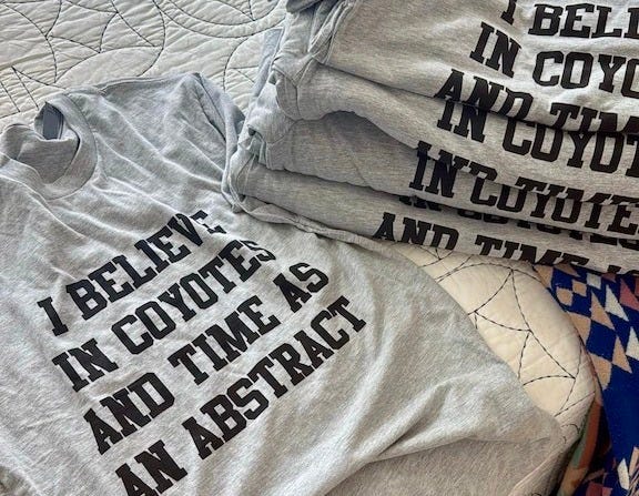 It’s a line from I Believe, from Side 2 of Lifes Rich Pageant. It’s a perfect snapshot of the R.E.M. aesthetic: a soaring yawp (I believe!), a poetic image I can’t explain but just makes sense (I believe in coyotes!), and Michael Stipe’s genius freedom from standard grammar (‘and in time’ would neatly complete the list, but and time arrives as a new and separate thought.) It’s also a nifty summary of Nora and I’s own R.E.M. fandom. She first played the band for me in our 1990s Phoenix childhood full of silkscreened howling coyotes. Even then the American frontier myth had shriveled down to a t-shirt. We Zonie kids had nothing else to believe.