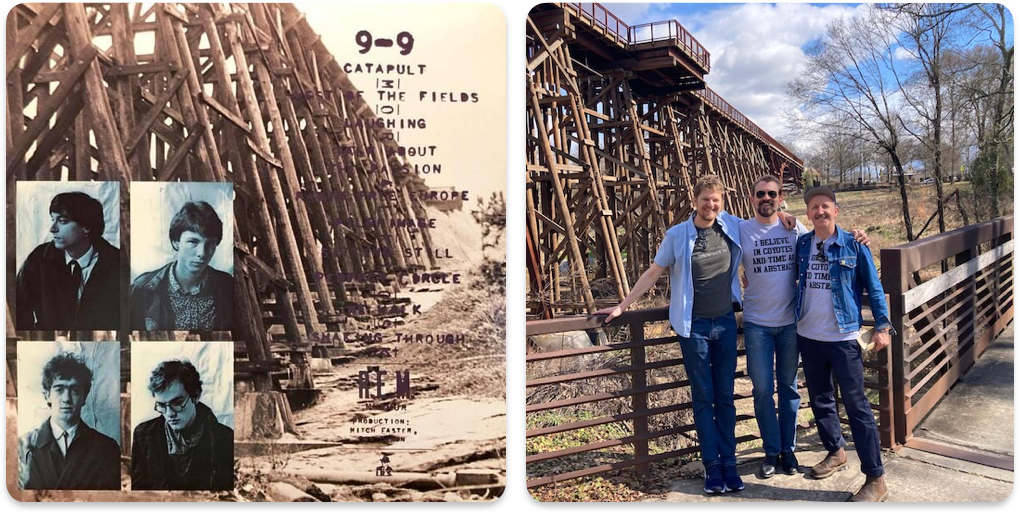 Next on the R.E.M. Week’s posted schedule is a visit to The Trestle. That’s the old railroad bridge featured in Civil War-esque sepia tone on the back cover of R.E.M.’s first album Murmur. The day is bright and climate-change warm. The original rotting Trestle was torn down and rebuilt in 2021 as part of a new urban park. What was once a gothic dead end is now a jogging trail, with carefully-matched replacement timbers linked up with snazzy pre-rusted steel arches to form a new Frankenstein bridge. It’s a classic Ship of Theseus: to preserve the past, you’ve got to straight-up replace it.