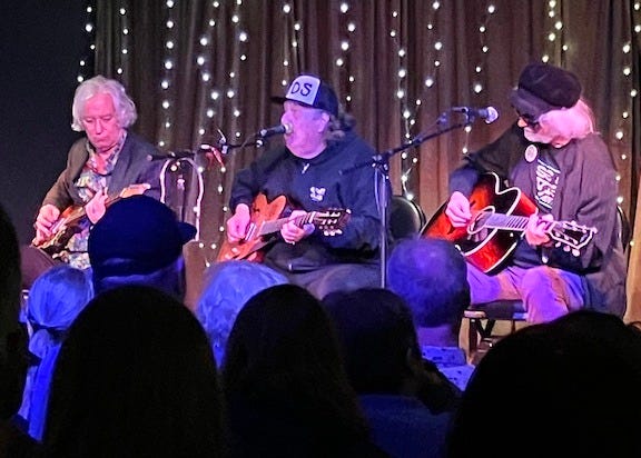 Then Peter Buck comes out and I AM IN THE ROOM WITH R.E.M.! Peter sits in a chair, too. Beside him sit his old mates Kevn Kinney of Drivin’ n’ Cryin’ and longtime R.E.M. sideman Scott McCaughey. It’s Kevn’s night; Peter and Scott are watching chords and following along. It’s all very chill but then Peter pulls out a mandolin and with a single strum it’s suddenly THE MANDOLIN, the Losing My Religion mandolin heard round the world.4 I felt a great disturbance in the force. I shoot a glance at Andrew. He felt it, too.