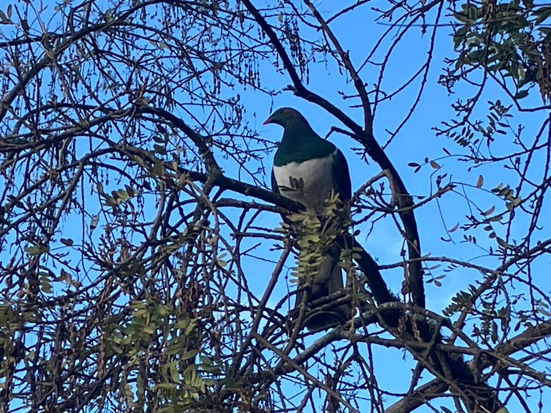 And in the spirit of Rykers’ book I’ll close with my recent bad cellphone pic of our local kererū (his kind won Bird of the Year in 2018). We’ve got five here in Greytown proper, two mating pairs and one lonesome widow. The solo dude’s been flapping up and down our street all week, scoffing seeds from the still-barren kõwhai trees. We’re neighbors, certainly. Compatriots, I’m not so sure. Can a kererū ever be a Kiwi? Can I? But no matter. I adore him. What photo, what nation, could ever do him justice? //