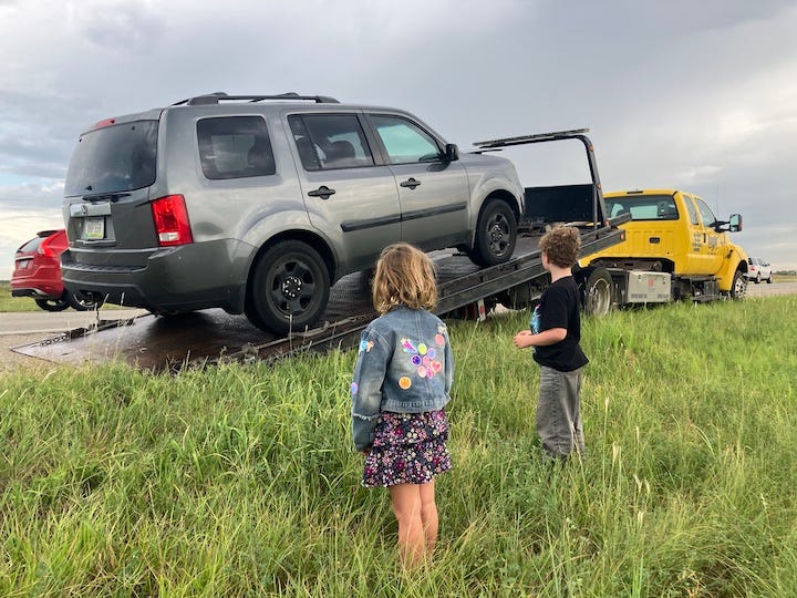 Our car died on I-70 outside Salina, Kansas. While we waited for the tow truck, a local sheriff’s deputy kindly pulled up to wait with us on the highway shoulder. The deputy was a dad about my age, with mirrored shades, a Santa Claus belly, and salt in his beard. We chatted in the tall grass as the kids hunted for snakes. We talked family roadtrips, Colorado memories, crazy drivers. Then came the confession.