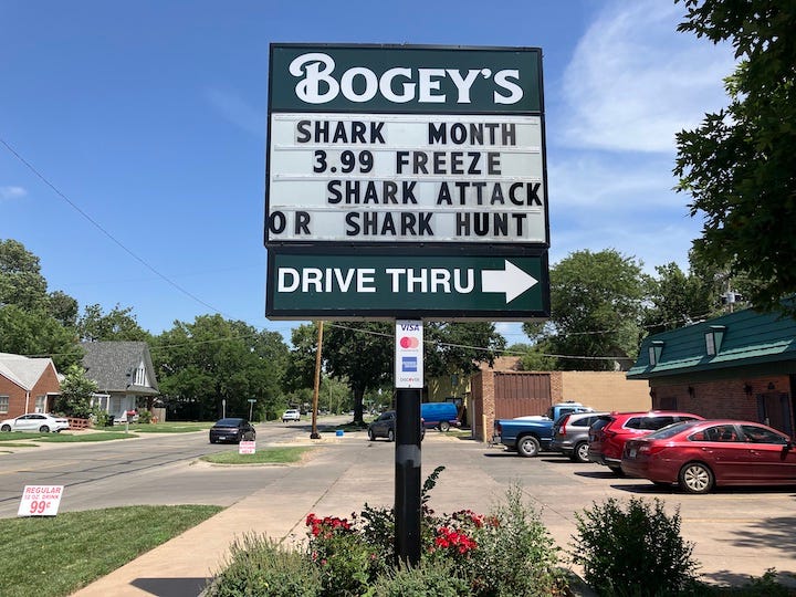 That opening crash—aw hell, man. But I flew home in search of such moments, didn’t I? I sang along under my breath with squawky young Dylan. I sang along over my breath. What do I care what the driver thinks? HOW DOES IT FEEL, to be chasing down a resurrected Honda Pilot in the dead goddamn middle of the America I left but can’t stop returning to? We cruised past the Union Building and the churches and the dairy drive-in advertising SHARK MONTH and made for the south side of town. Always the south side, in America. The trees get smaller, the paint flakier. NO DIRECTION HOME.